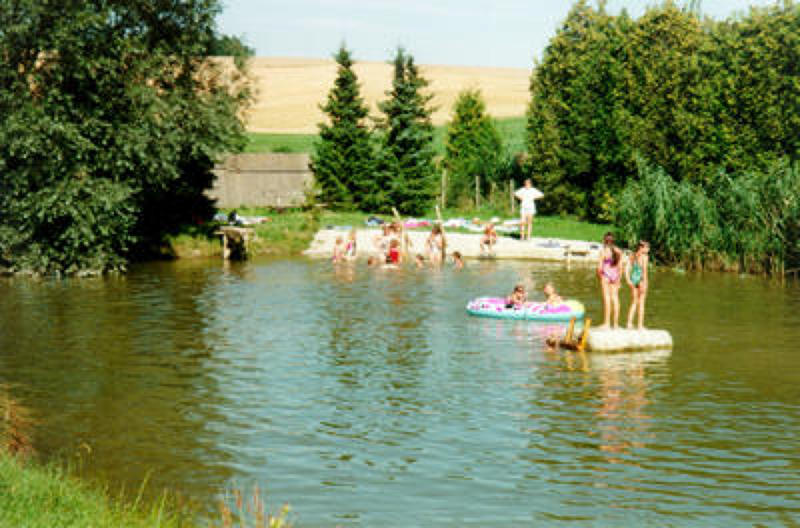 * Ein großer Badeteich mit Liegewiese und 2 Flößen (5 Minuten)
