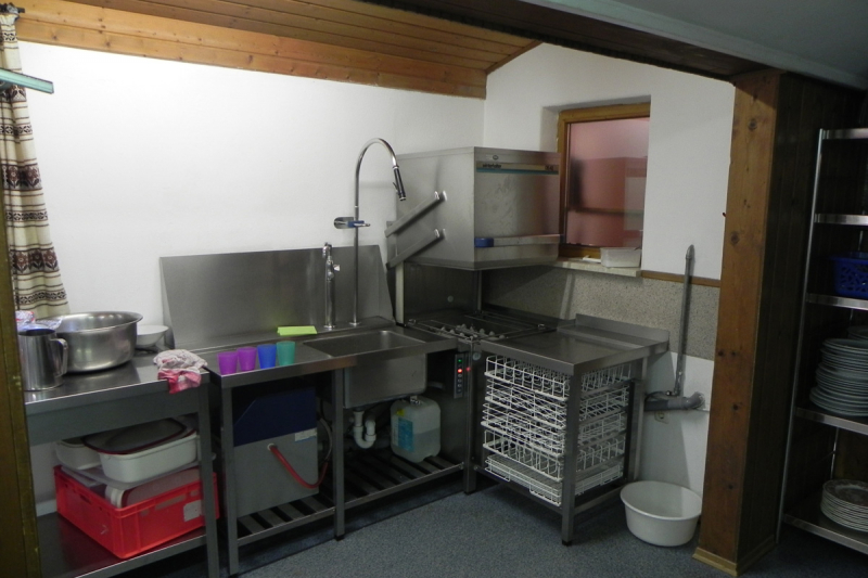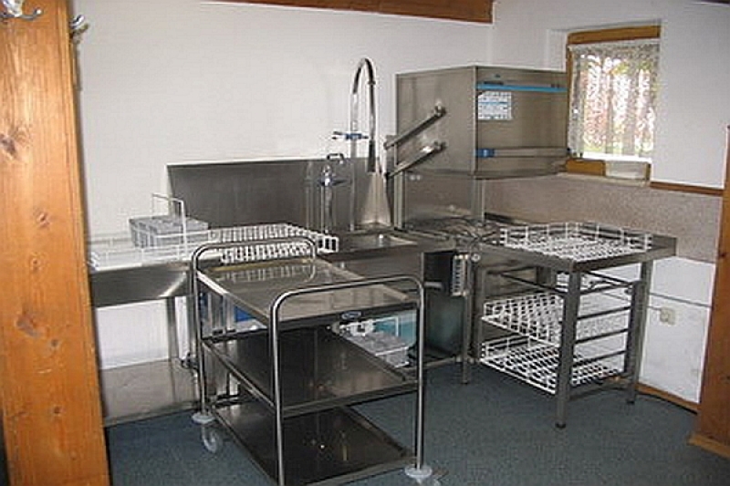 Die professionelle Gewerbeküche ist ausgelegt für 80 Personen und beinhaltet Edelstahltöpfe, eine Kipp-Pfanne, einen Gasherd mit Backofen, einen Elektroherd, eine kleine Mikrowelle, 2 kleine Mixer, 2 Kaffeemaschinen etc.