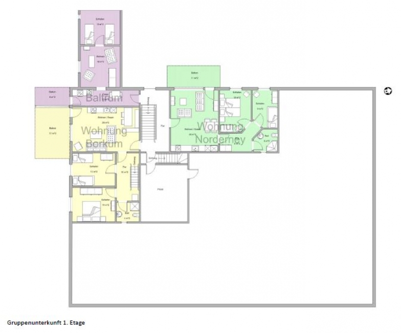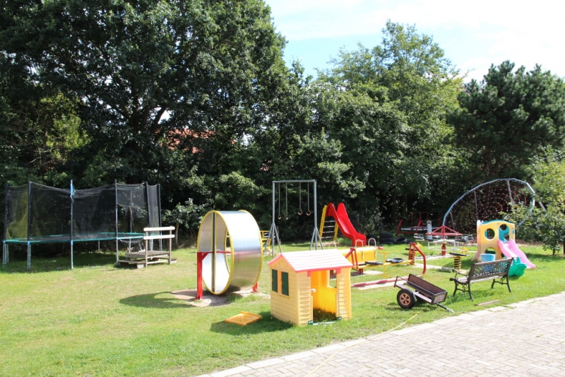 Das renovierte Selbstversorgerhaus besteht aus insgesamt sechs, in sich abgeschlossene, Ferienwohnungen verschiedener Größen und hat eine teilweise neu ausgestattete Einrichtung. Im Erdgeschoß findet sich der zentrale Gruppenbereich für das gemeinschaftliche Beisammensein. Es gibt eine halboffene, moderne und gut ausgestattete SV-Küche, einen Speiseraum mit dem gemütlichen Aufenthaltsbereich, sowie ein separates Billardzimmer mit Billardtisch. Weiterhin gibt es noch eine ca. 100 qm große so genannte „Spielscheune“, die von außen zu erreichen ist.