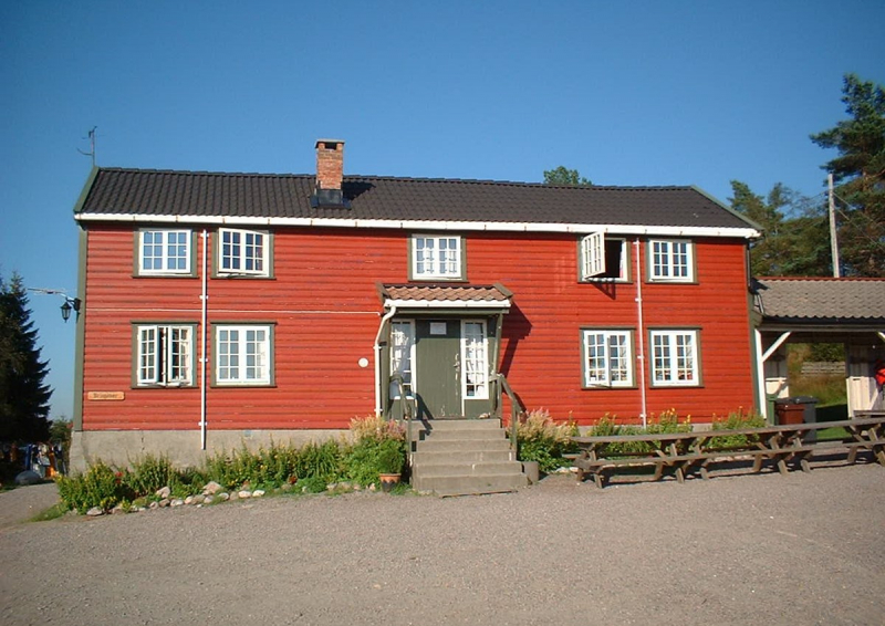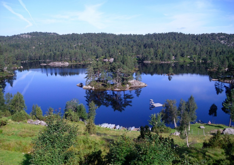 Eine Unterkunft typisch für Norwegen; am See gelegen, mit Kanus, Badesteg und Badeinsel
