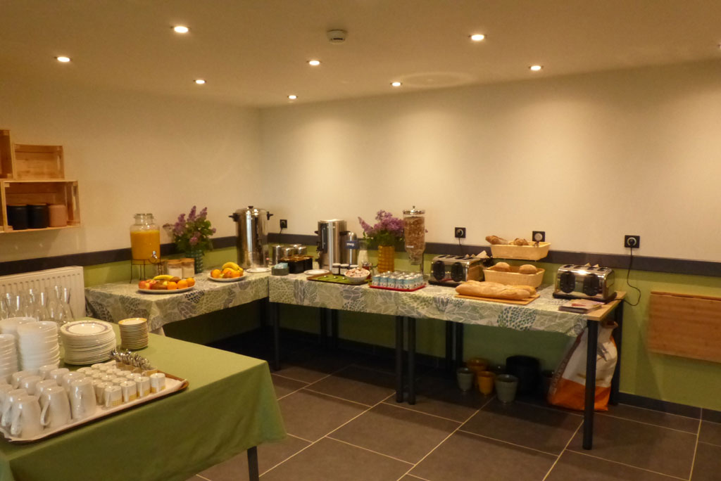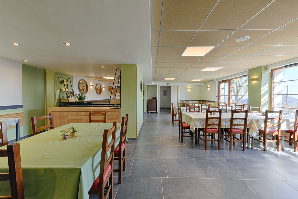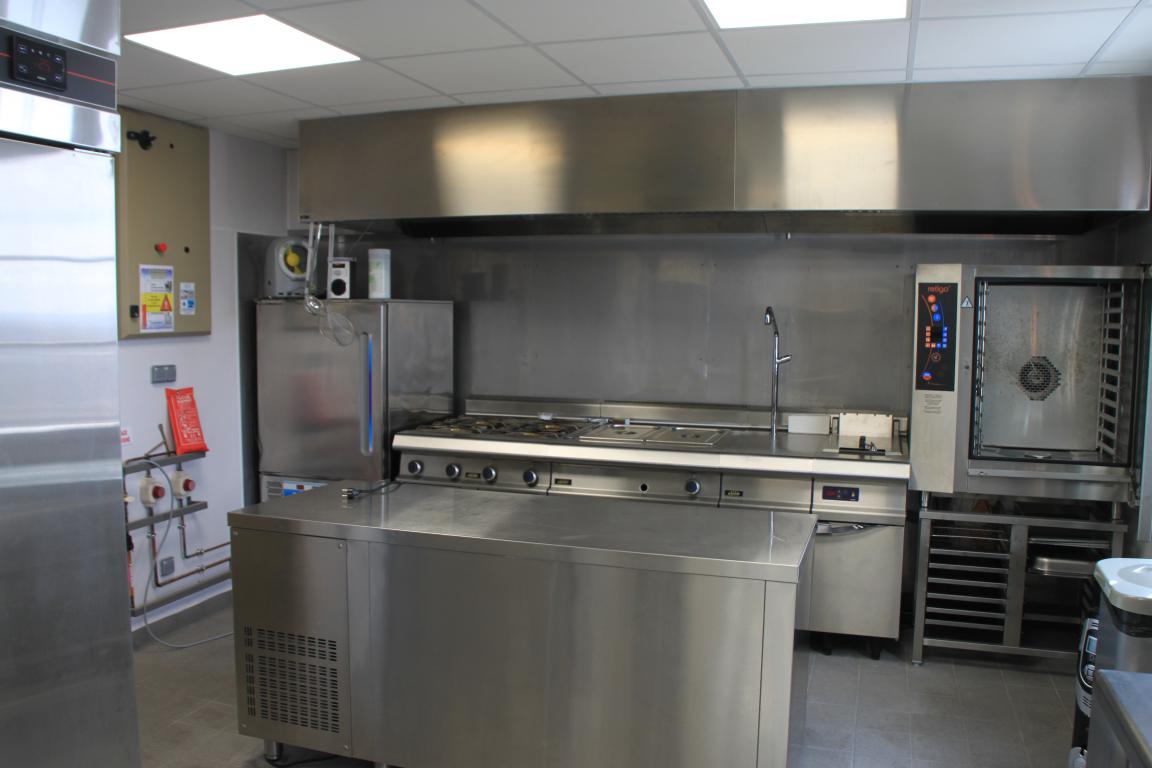 Erdgeschoss: Ein 79 qm großer Speisesaal (61 Plätze) & eine 60 qm große professionelle Großküche mit Geschirrspüler und Gemüseküche