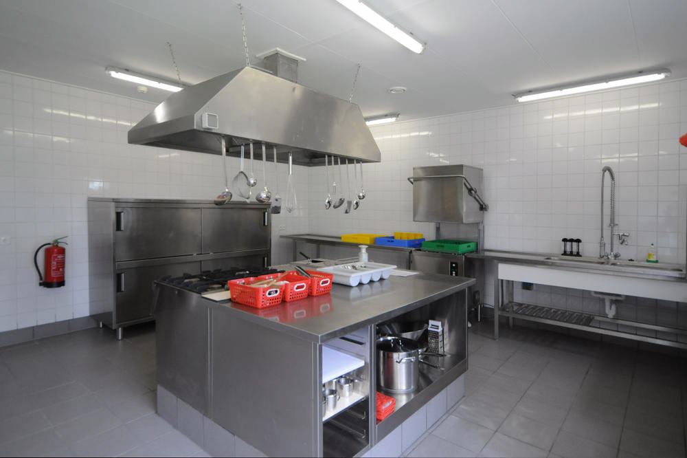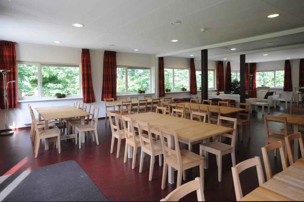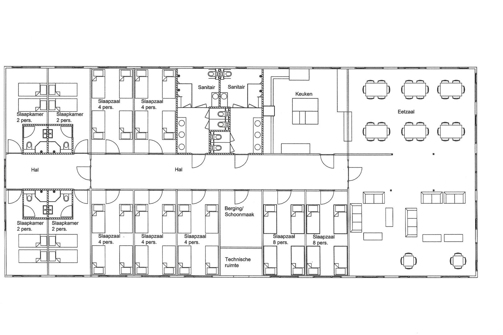 Das erste, was im Gruppenhaus auffällt, ist der ungewöhnlich breite Flur, absolut untypisch für niederländische Verhältnisse! Es gibt vier Doppelzimmer mit Einzelbetten und jeweils eigenem Bad (Dusche, WC & Waschbecken), sowie weitere fünf 4-Bettzimmer (Einzelbetten) und zwei größere Schlafzimmer (8-Bett) mit jeweils vier Etagenbetten. Für pflegebedürftige Personen, die auf ein Pflegebett angewiesen sind, können diese über einen regionalen Anbieter (kostenpflichtige) geordert werden, inklusive natürlich Bring- & Abholdienst. Weiterhin stehen behinderten Mitmenschen insgesamt zwei behindertengerechte Bäder zur Verfügung, ausgestattet jeweils mit ebenerdiger Dusche, Duschstuhl, normalen Waschbecken und einem WC mit entsprechenden Haltebügeln. (Laut uns vorliegenden Informationen sind deshalb auch „nur“ max. vier Rollstuhlfahrer angegeben; es finden aber auch weitere Rollstuhlfahrer Platz in dieser Unterkunft. Des Weiteren sind noch zwei Gruppenbäder vorhanden, jeweils mit einer abschl. Duschkabine, zwei Toiletten und einem Waschtisch mit drei Waschbecken. Der helle und freundliche Ess-/Aufenthaltsraum (ca. 130 qm), besticht in erster Hinsicht durch sein recht neuwertiges & modernes Mobiliar: eine weiße & sehr gemütliche Couchlandschaft aus pflegeleichtem Leder, sowie auch der großzügig bemessene Essbereich mit ausreichend Tischen/Stühlen. Ferner befinden sich in diesem Raum noch mehrere Stehtische, als auch einen Kicker, dass typisch niederländische Sjolbak, sowie einen Flachbildfernseher und eine kleine HiFi-Anlage. Die SV-Küche (ca. 36 qm) ist professionell und großartig ausgestattet und wartet hier sogar mit einer Kochinsel auf, in dem sich der Gasherd (4flg.) und eine Friteuse befindet. Weiterhin gibt es einen Geschirrspüler, einen Backofen, sowie einen Kühlschrank und eine Gefriertruhe, als natürlich auch die Mikrowelle, einen Tea-Maker und mehrere Kaffeemaschinen.