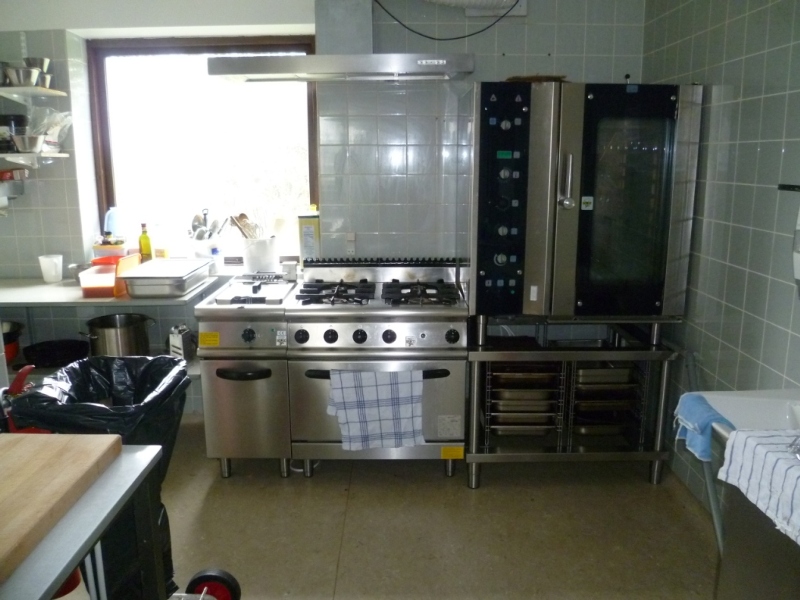 1 großer Herd mit Backofen, 3 Kühlschränke, 1 Tiefkühltruhe, 1 Industriespülmaschine, 1 Rührmaschine, sowie ausreichend Besteck, Geschirr, Töpfe und Pfannen