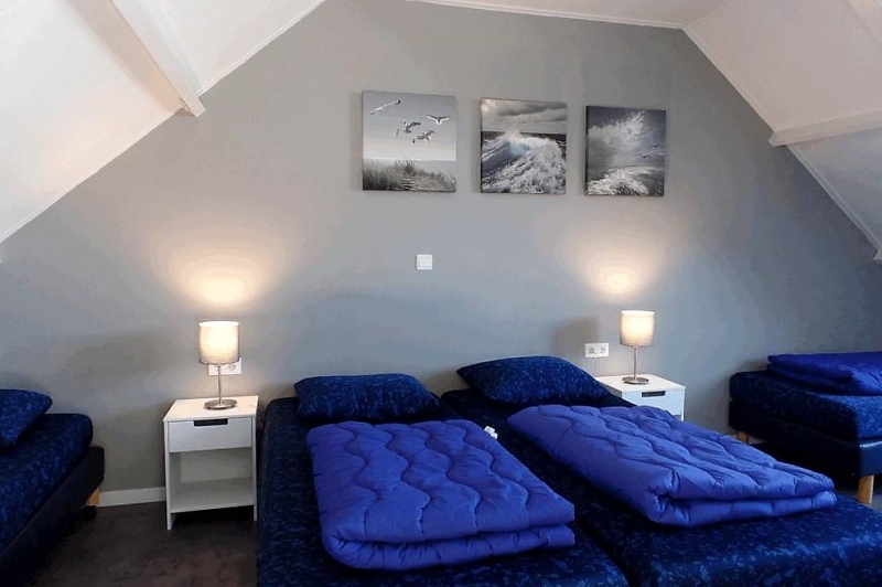 Im Erdgeschoß befinden sich insgesamt sechs Schlafzimmer: 5x 2-Bettzimmer, teilweise mit Doppelbett oder Einzelbetten und ein 4-Bettzimmer. Alle Schlafzimmer haben ein eigenes Badezimmer, ein weiteres separates Bad befindet sich im Eingangsbereich des Gruppenhauses. (In einem der Schlafzimmer sind auch zwei „Notbetten“ zu finden, beide 160cm x 80cm und natürlich mobil. So dass diese Betten dann auch in andere Zimmer aufgestellt werden können.) Die weiteren Übernachtungsmöglichkeiten befinden sich im Dachgeschoß der Unterkunft: 2x 2-Bettzimmer und 1x 4-Bettzimmer, auch hier wieder jeweils mit eigenem Bad. Drei weitere Personen können in einem Einzel- & einem Doppelbett nächtigen, die sich beide unter der Dachschräge im oberen Flur befinden und durch Zuziehen eines schweren (blickdichten) Vorhanges wird die „Privatsphäre“ gewahrt. (Speziell, aber in den Niederlanden eben auch nicht ungewöhnlich …)