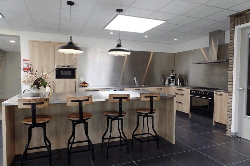 Die hochmoderne und sehr komfortable Küche ist ausgestattet (u.a.) mit einem Gasherd (6flg.) und Backofen, sowie mit Kühlschrank und einem separaten Gefrierschrank, einer Spülmaschine, Wasserkocher und Kaffeemaschine. Der „Eyecatcher“ im Speiseraum, neben dem Geschirrschrank, der als Tresor daherkommt, ist aber sicherlich die Kücheninsel, die sich sowohl als Arbeitsfläche, als auch als Theke und / oder als Anrichte für (z. B.) ein Buffet eignet. Weiter auffallend im Raum sind die Tische mit der Bestuhlung, beides in ungewöhnlicher Optik und ultramodern. Etwas separiert findet sich ein gemütlicher Wohnraum mit modernen Sitzmöbeln und Blick auf die vordere Terrasse und den Spielgeräten; die Kids somit immer sicher im Blick … In einer schmalen und hell gehaltenen Klinkerwand, befindet sich der Gaskamin, der abends sicherlich für eine heimelige und gemütliche Stimmung sorgt.