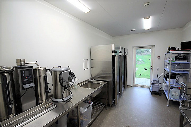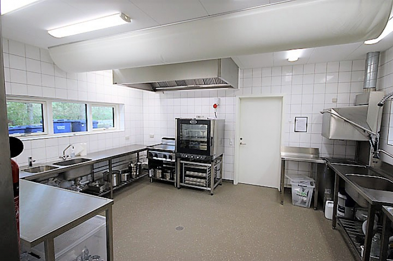 Einen Großküchen-E-Herd (4) mit Backofen, 1 Gefriertruhe in separatem Raum, 2 große Kühlschränke, davon einer für Gemüse, 1 große Spülmaschine, 1 Kaffeemaschine sowie Geschirr für 60 Personen.