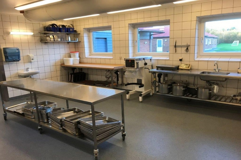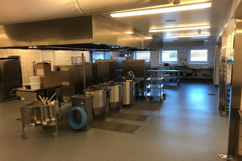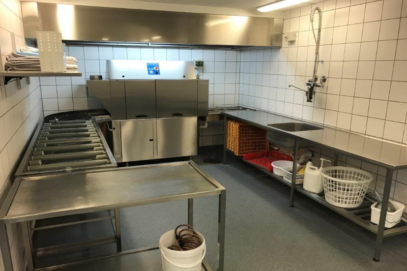 1 Spülraum mit großer Spülstraße, Kaffeemaschine (Kaffee hierfür mus dazu gekauft werden), Küchenmaschinen, Kartoffelschälmaschine, Geschirr für 180 Personen, Waschmaschine und Trockner
