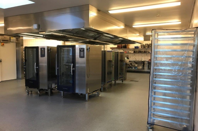 Kipppfannen, Kipptöpfen, Elektro-Induktionsherd, 4 Konvektomaten, 1 Kühlraum (ca. 9 qm, 4°C),