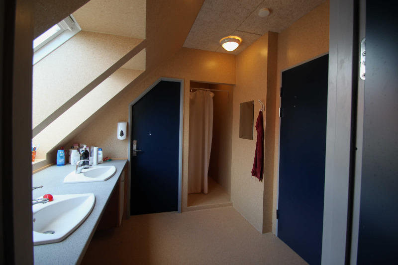 In jedem Schlafgebäude befinden sich 4 Duschen und 4 Toiletten; gleichmäßig auf beide Etagen verteilt.