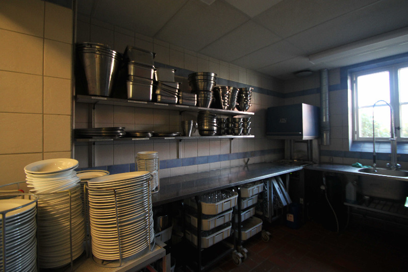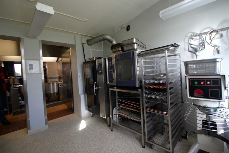 1 gr. begehbarer Kühlraum, 1 gr. begehbarer Tiefkühlraum, 1 gr. Kipppfanne, 2 gr. Kipptöpfe, 1 Schneidemaschine, 1 Spülstraße mit Industriespülmaschine, 1 Rührmaschine, 2 gr. prof. Backöfen, 1 Mikrowelle, 1 Gemüseraum zum Säubern und Schälen, 1 Vorratsraum, ….