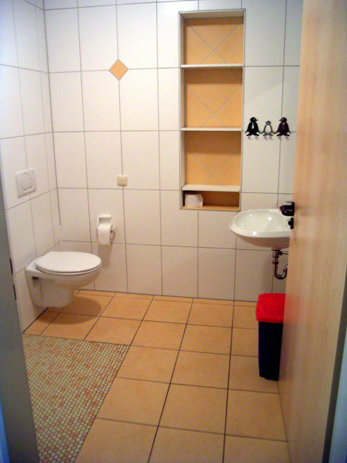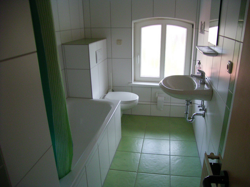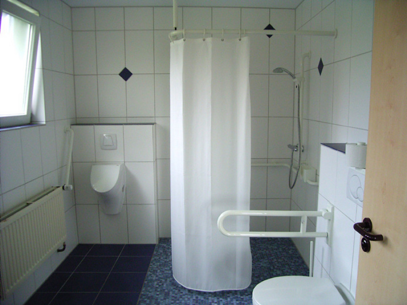 Im Erdgeschoss finden sich 5 Zimmer. Hier ist Platz für etwa 18 Personen, je nach Raumnutzung und Bettenverteilung. Vier Bäder stehen den Gästen zur Verfügung. Alle Bäder sind mit Dusche, WC und Waschbecken ausgestattet. Die Duschen sind ebenerdig. Eines der Bäder ist barrierefrei, zwei Bäder sind an die barrierefreien Normen angelehnt und somit auch Rollstuhl geeignet. Die Flure und Zimmerzugänge sind schwellenlos, um auch hier ein Höchstmaß an Bewegungsfreiheit zu ermöglichen.