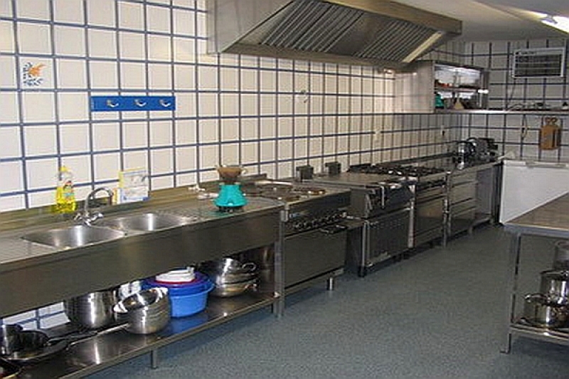 Die professionelle Gewerbeküche ist ausgelegt für 80 Personen und beinhaltet Edelstahltöpfe, eine Kipp-Pfanne, einen Gasherd mit Backofen, einen Elektroherd, eine kleine Mikrowelle, 2 kleine Mixer, 2 Kaffeemaschinen etc.